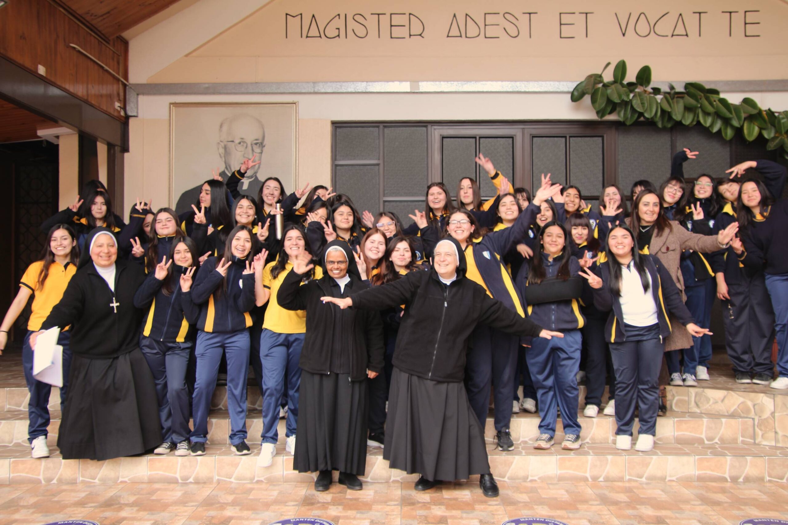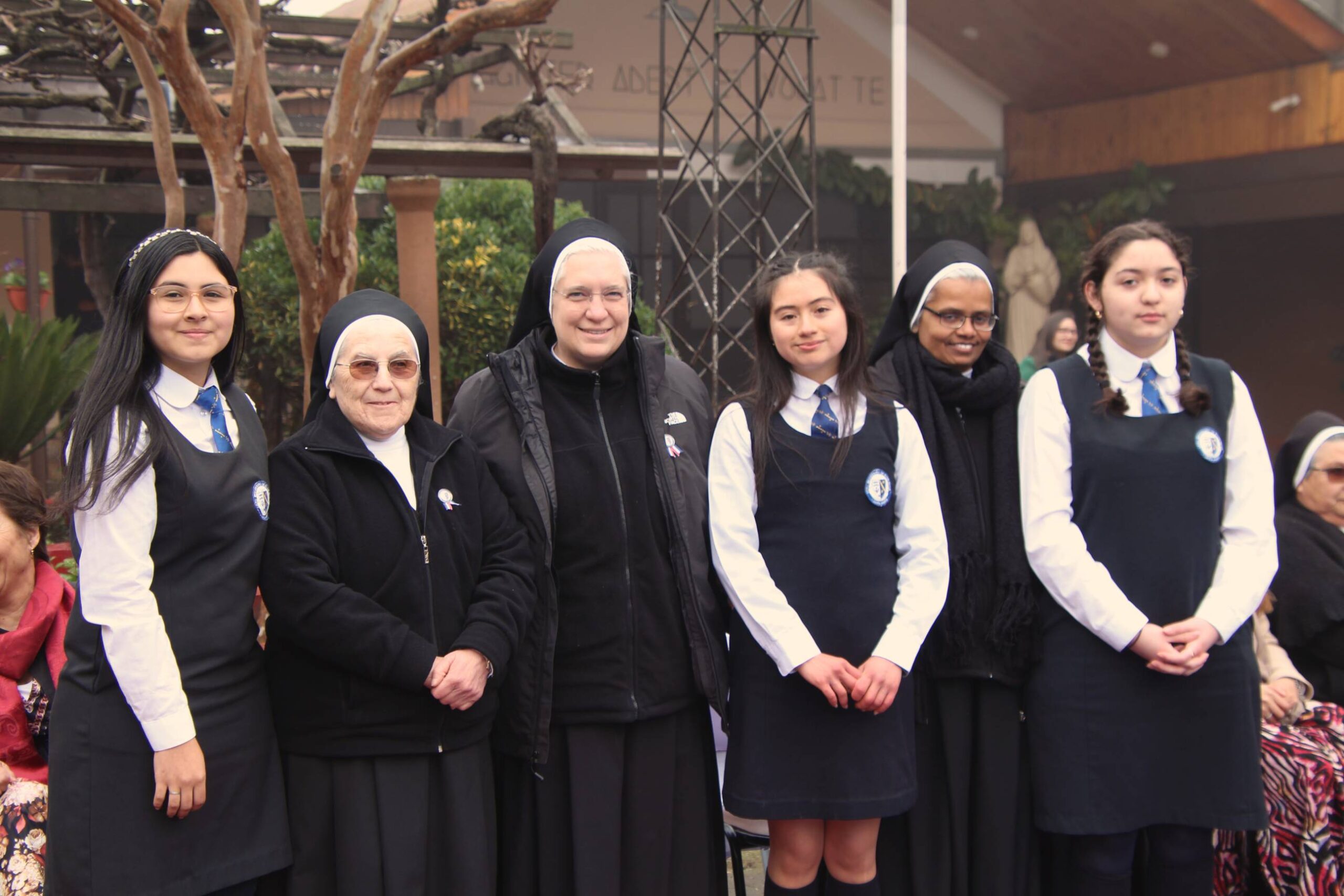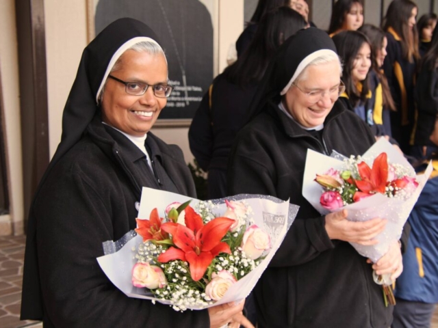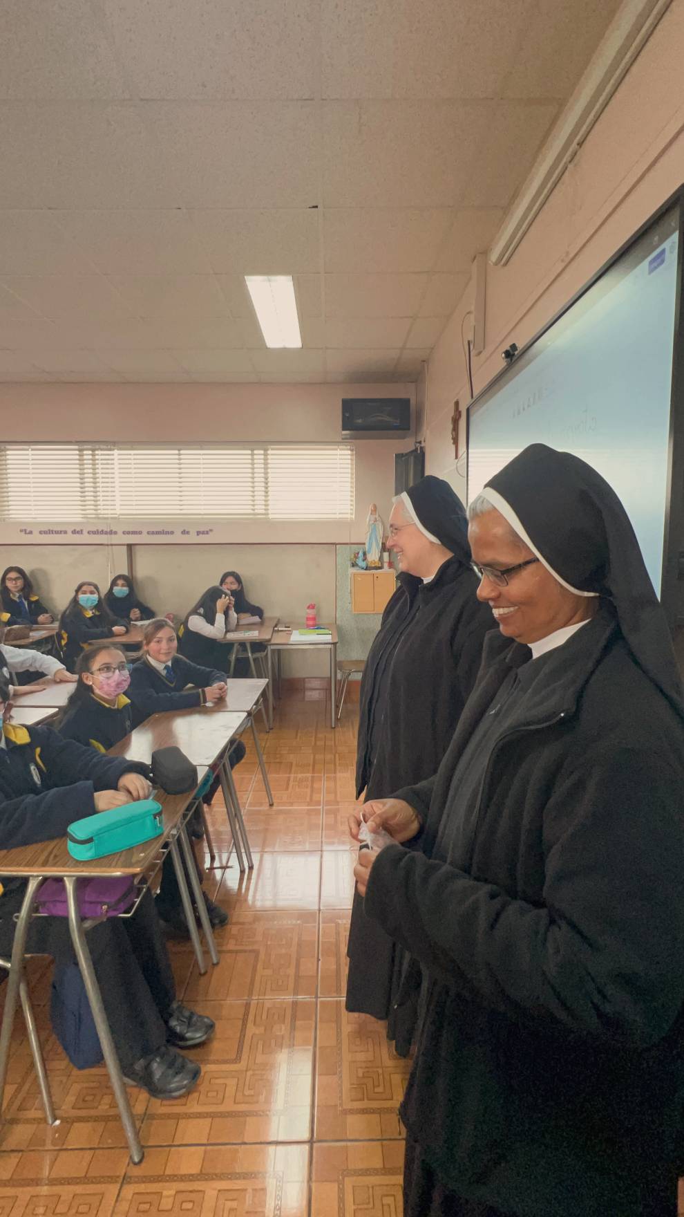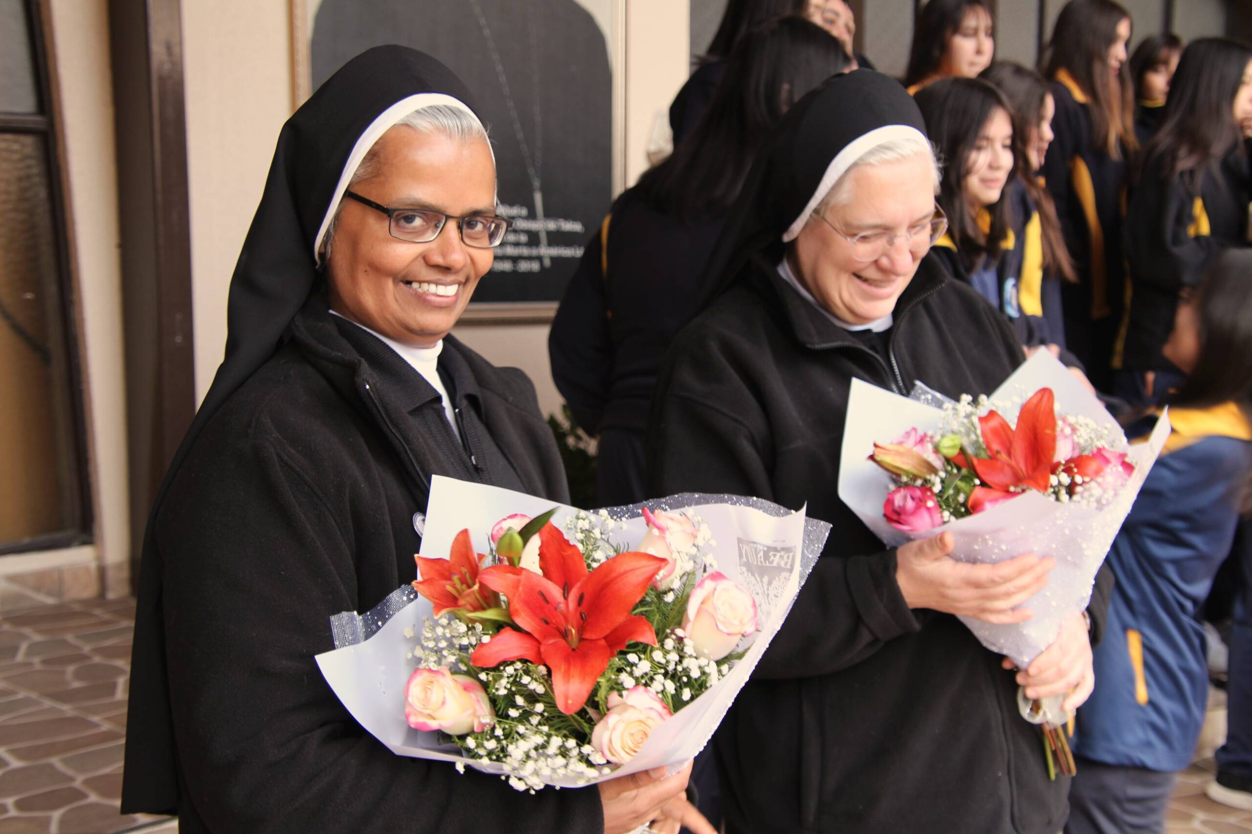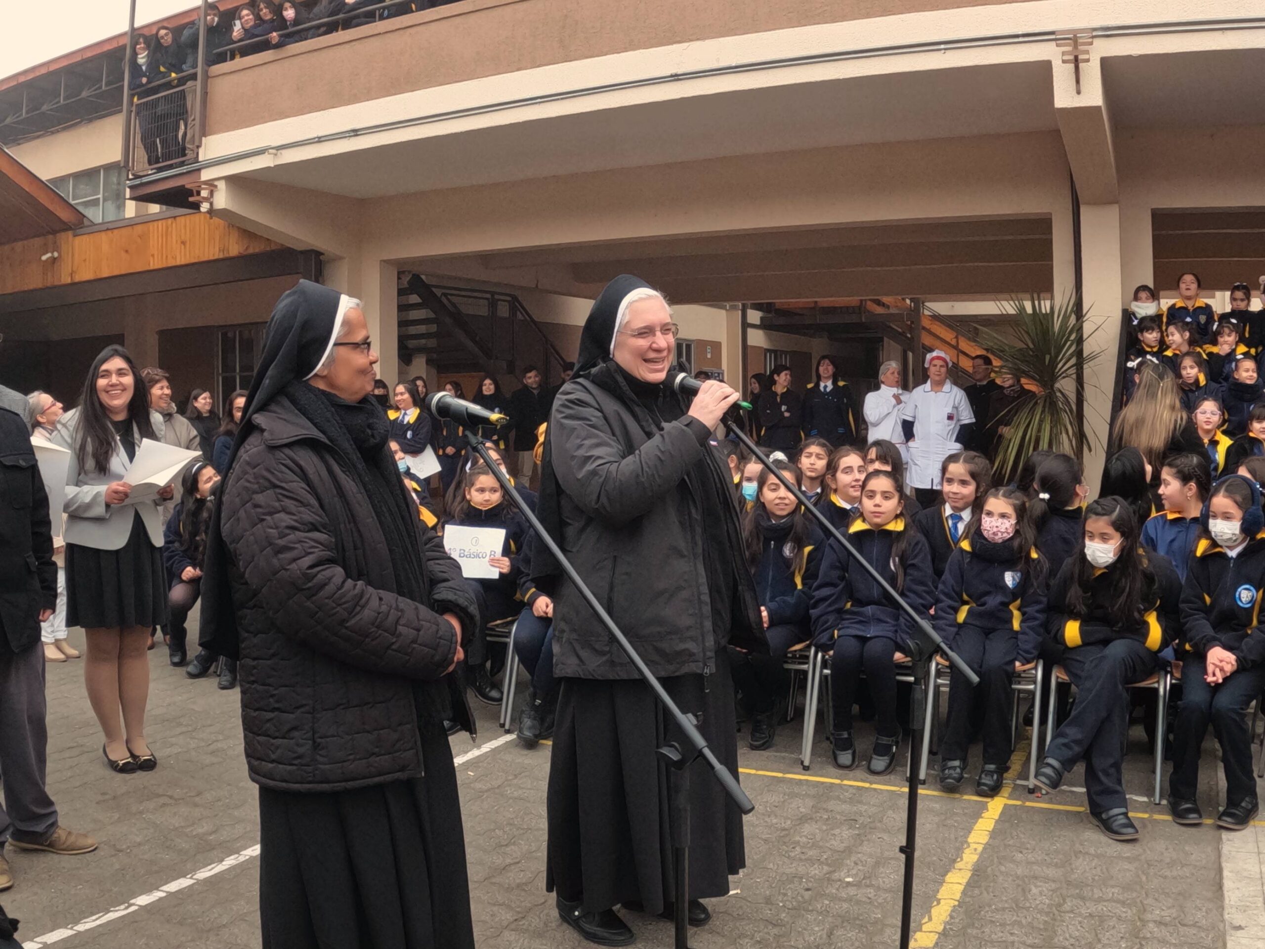 Sor Teresa Aceituno Farías, agradeció el compromiso de los docentes, y su importante labor y colaboración para el despliegue de este proyecto educativo, en esta ocasión felicita al profesor Miguel Guerrero quien ha tenido un notable compromiso preparando a la Banda Femenina de Guerra, y por supuesto, a la coordinación del equipo de Inspectoría General y a quienes le colaboraron en la preparación de todas las actividades itinerantes de saludo, reconocimiento y despedida para nuestras ilustres visitas: Sor Chiara, Sor Bindu y Madre Nazarena.