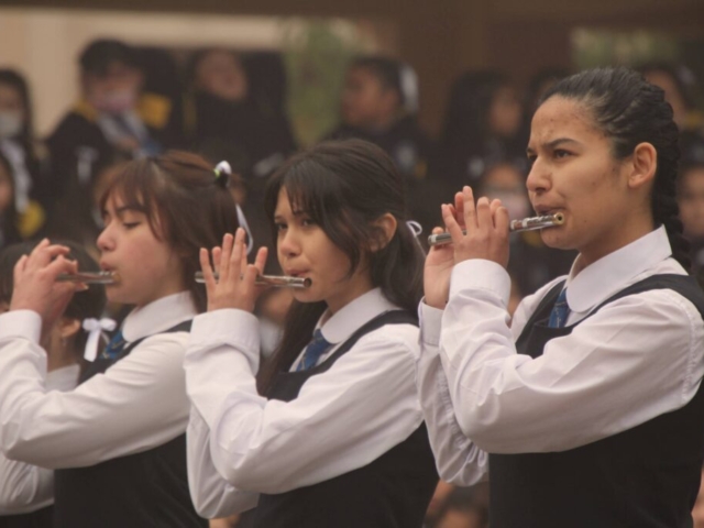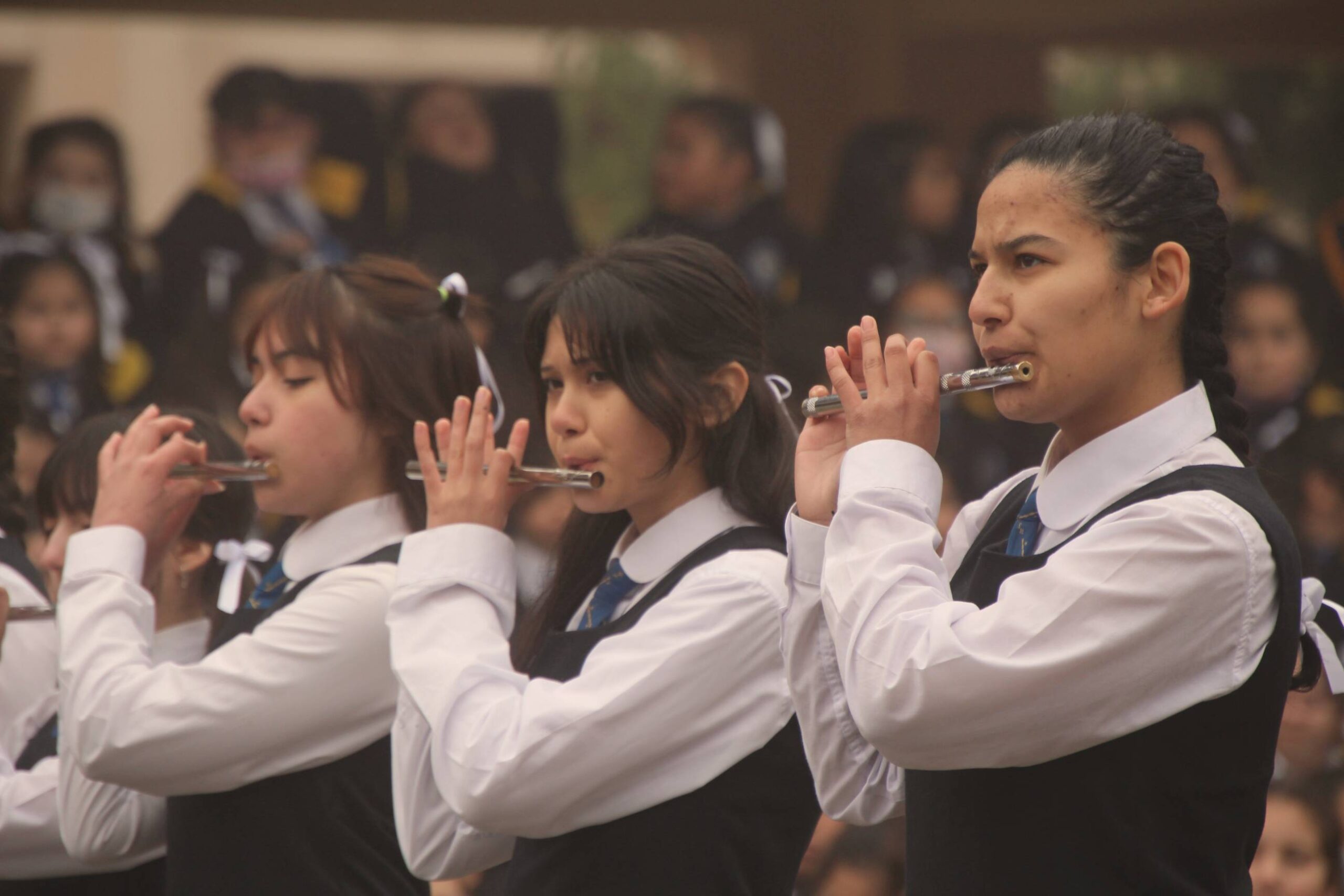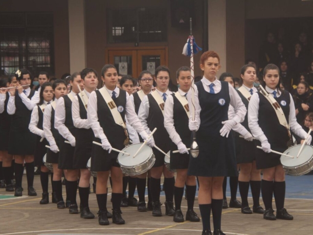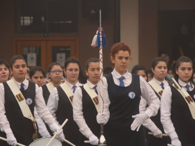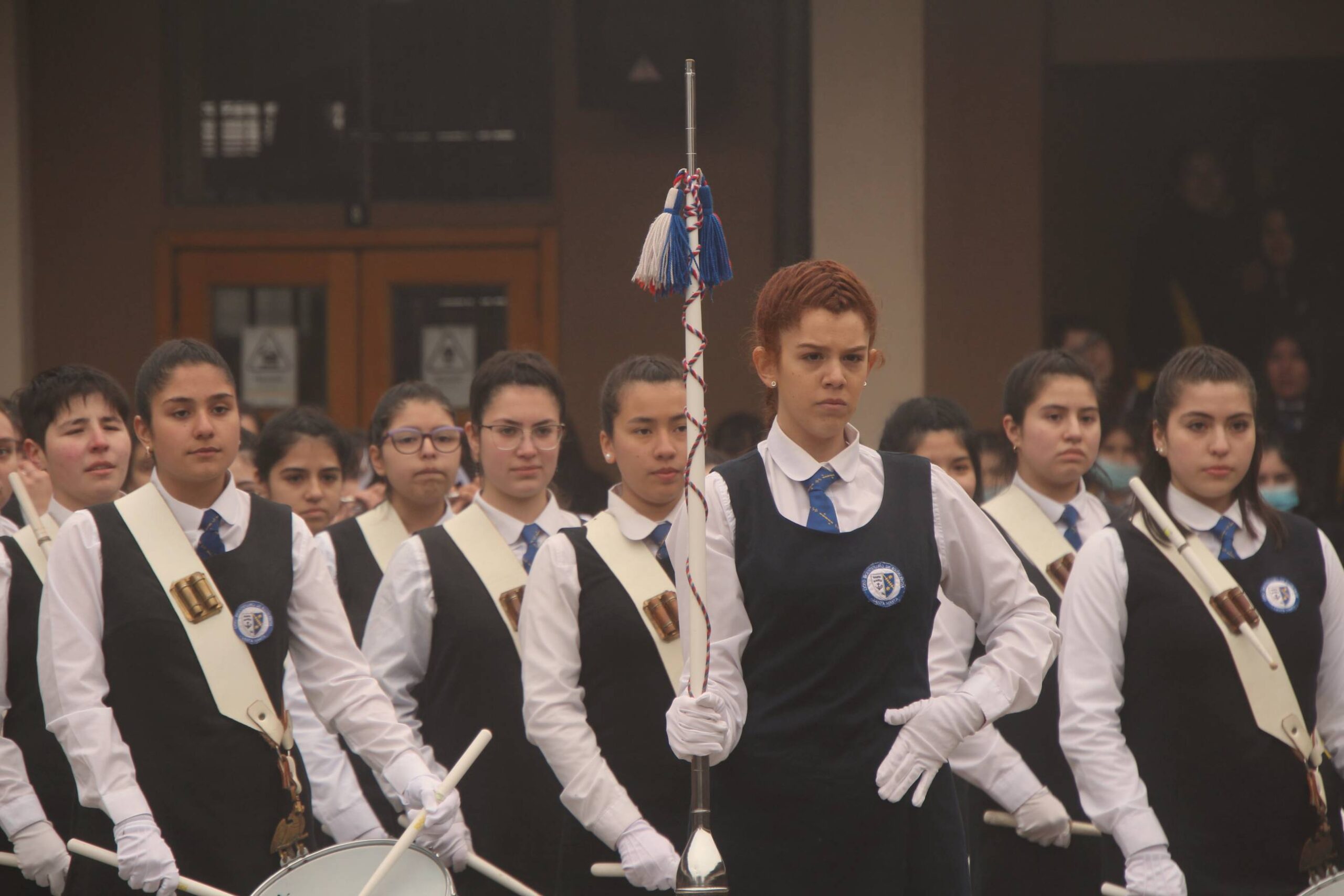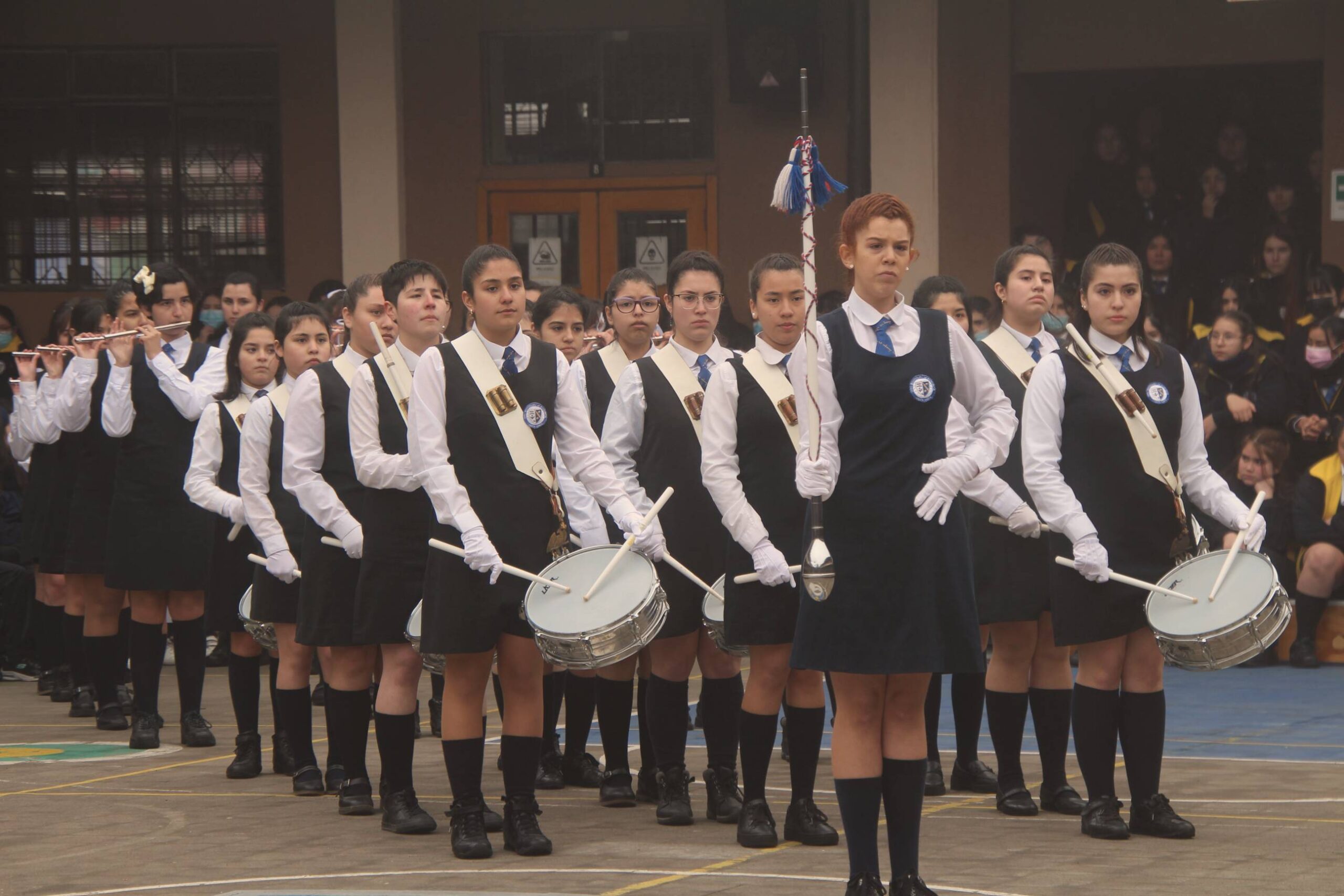 En esta ocasión, la Banda Femenina de Guerra, creada y dirigida desde el 2014 a la actualidad por el profesor Miguel Guerrero Roco, fue la encargada de condecorar a nuestras importantes visitantes. Esta impecable agrupación marchó con elegancia y delicadeza saludando con cariño y firmeza a las religiosas que nos acompañaron desde el lunes 7 de agosto. La Banda Femenina de Guerra, hizo ingreso por las puertas de acceso ubicadas hacia la 4 sur, entrada simbólica que representó el recibimiento de las primeras religiosas que llegaron a la humilde ciudad de Talca y que ingresaron por las mismas puertas ubicadas allí hace ya 75 años atrás.
